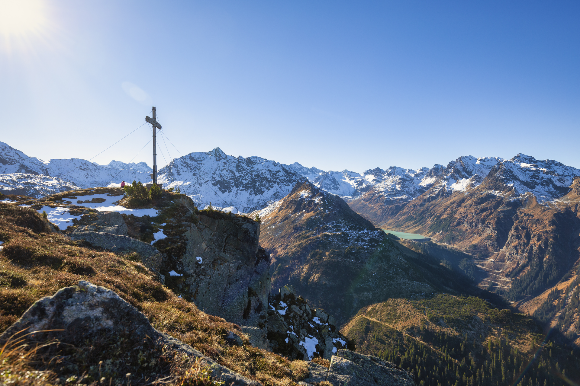 Über die Staumauer Kops geht es auf einem Spazier- und Alpweg leicht bergab bis zur Abzweigung mit der Hinweistafel "Breitspitze". Kurz führt der Wanderweg über die Kopsalpe, anschließend über einen Steig mit tollem Ausblick zur Ballunspitze. Der Wanderweg führt über Höhenstufen an einigen Seen vorbei, bevor das Gipfelkreuz in Sichtweite ist. Von der Breitspitze geht es rechts weiter zur Vallüla Alpe. Der Abstieg durch den Wald führt uns direkt auf die Straße nach Partenen.