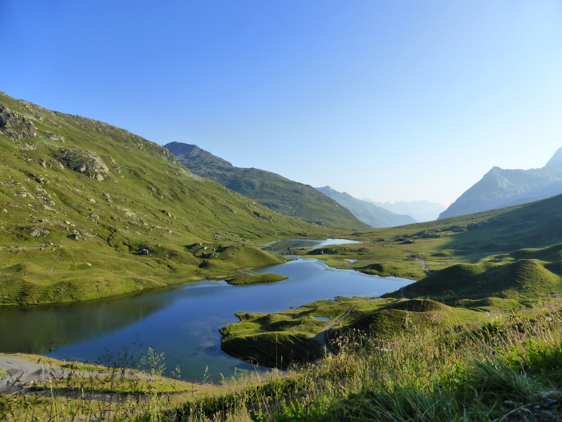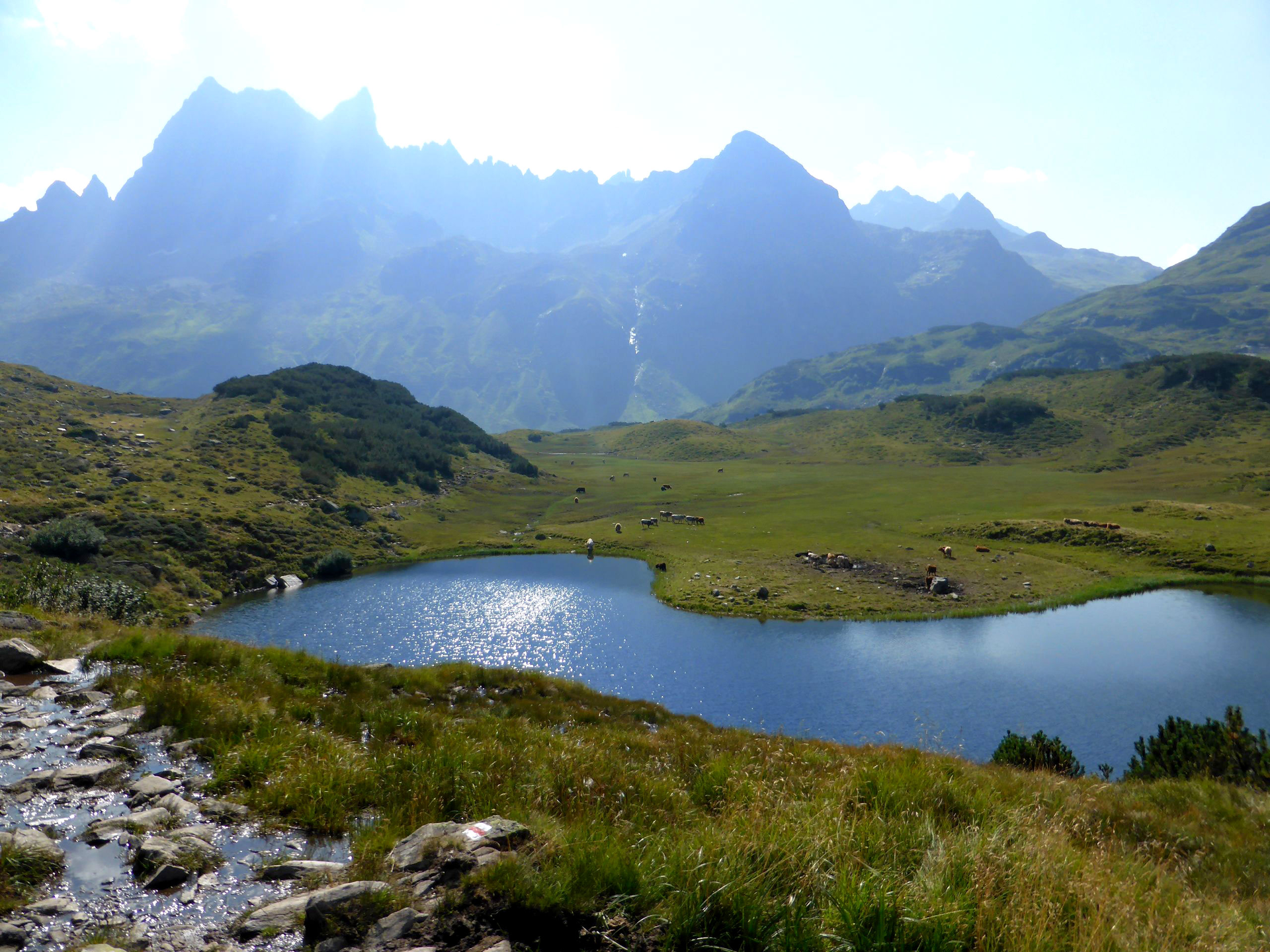Am nächsten Morgen startet die nächste Etappe bei der Neuen Heilbronner Hütte und führt dich hinunter zur Verbellaalpe. Vor der Verbellaalpe querst Du die Alpstraße und nimmst den Weg, der über die schöne Alpwiese führt Richtung Wiegensee.
