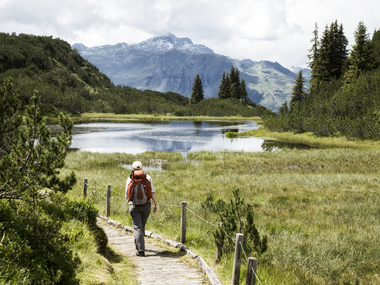 The Wiegensee is one of the oldest reservoirs in the Montafon valley, and the European nature reserve of the same name offers a variety of fascinating moorland habitats with rare animal and plant species. This climate hike deals with the effects of climate change and takes us right through the high moor landscape. We learn exciting details about the formation of the moors and the importance of peat bogs in mitigating climate change. Together with climate guide Christian Fuggi, we delve into existing and future challenges and try to deepen or build our understanding of the consequences of climate change.